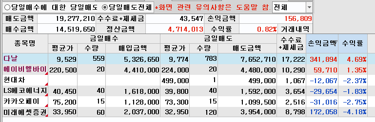 - 현대차/카카오페이/LS에코에너지: 손절 및 정리. 현재 계좌 실현 손익 +156,809원으로 ‘빨간불’ 마감하고 무포지션 대기 중.