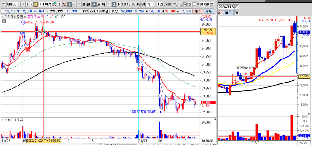 - 미래에셋증권: -4.18% 손절 처리 완료 (손실금 172,058원). 갭하락 출발 후 계획대로 잘라냄. 리스크 관리 성공. 힘들다!!~~~